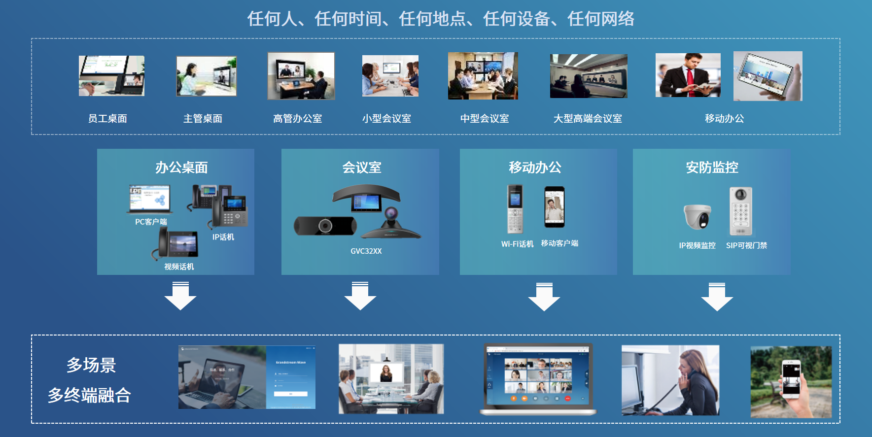 UCM6300A系列配套潮流网络IP话机、视频话机、Wi-Fi话机、移动APP、PC端、视频会议终端、网关,为中小企业提供一站式全场景的办公通信解决方案;